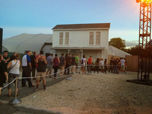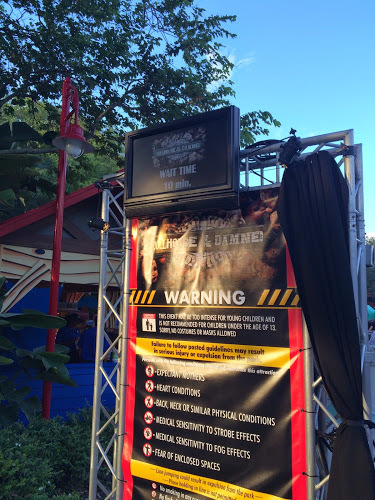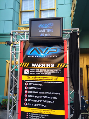 At 5:58 p.m., we were released from in front of Finnegan’s to the Alien vs Predator house, which was the first one to open. Due to some “technical difficulties,” the house didn’t actually begin accepting guests until 6:12 p.m. I was out the door by 6:18 p.m., by which time its line was posted at 45 minutes.
