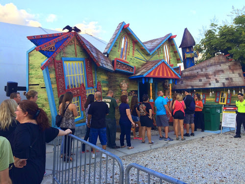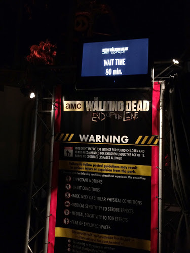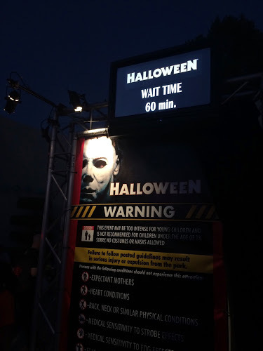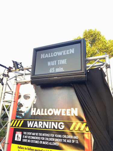 Within 10 minutes of the event officially opening, the wait for Halloween was posted at 45 minutes, and actually took 40. Ideally you should experience this house after dark, because of the excellent projection mapping effects used outside the entrance, but by sunset the line was 60 minutes or more.