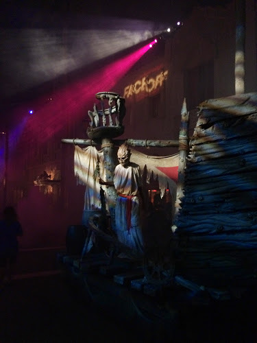 Queue entertainment is disappointingly lacking this year. The only house with a preshow worth mentioning is Halloween, with Giggles’ slideshow and Walking Dead’s trivia adding nothing to the storytelling. While waiting 35 minutes for the meh Dracula maze, I wondered why clips from the new film weren’t screening on the giant soundstage walls we were standing outside.