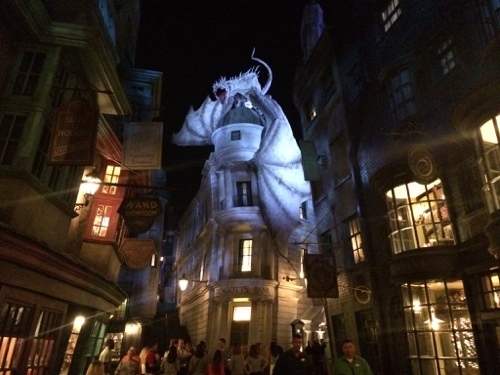 Diagon Alley in all its nighttime splendor.