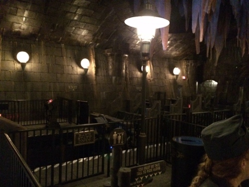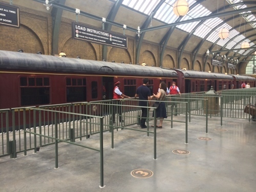 The passage to platform 9¾, from which Hogwarts students depart on their way to school, is concealed from Muggles by a seemingly solid brick wall, which you’ll witness guests ahead of you dematerializing through. [Spoiler: the "Pepper's Ghost" effect creates a clever but congestion-prone photo op, but you only experience a dark corridor with wooshing sound effects when crossing over yourself.]