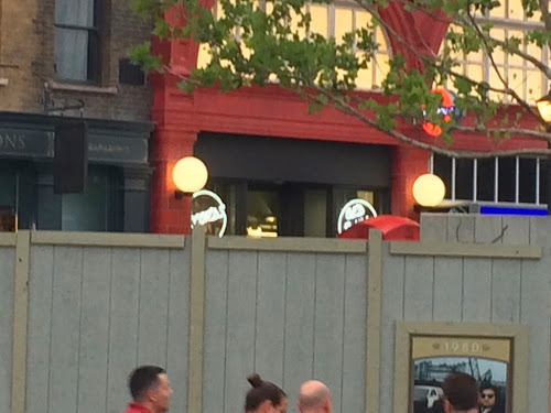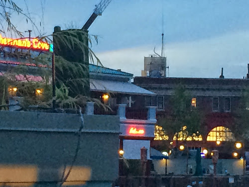 From the Simpsons waterfront behind Duff Brewery, the dragon is again hidden by the London Waterfront facades.