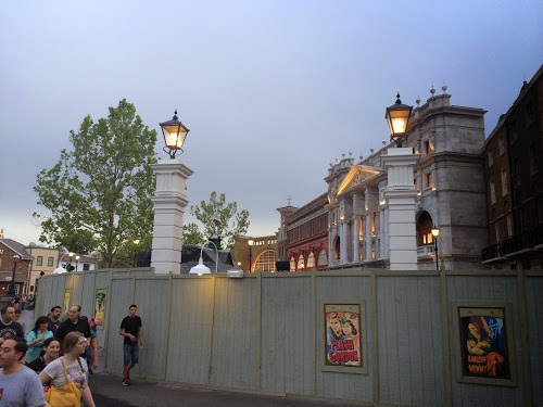 Ever since the Gringotts dragon was installed on top of the Diagon Alley bank, fans have been wondering how visible it will be from various places around the park. For starters, the Dragon is completely invisible from anywhere along the London Waterfront outside Diagon Alley, which is the most important place to conceal it from a theming perspective. Once you cross the bridge towards Men In Black, you can see a semi-obscured side view of the dragon from near the Roboasis Coke display.