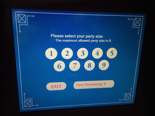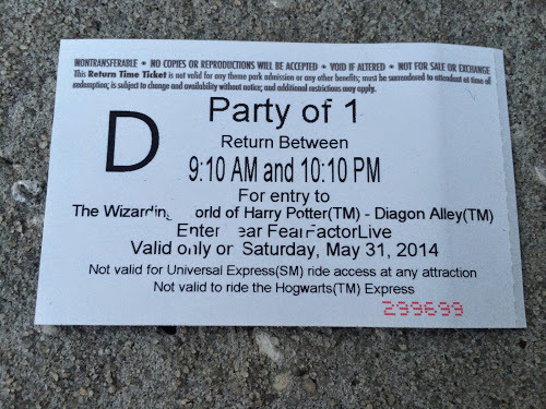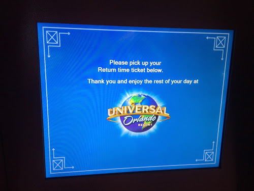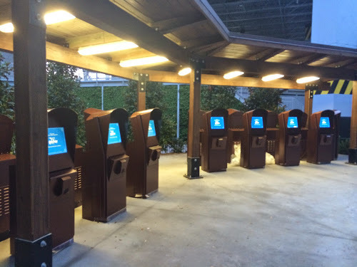 As reported previously, the service area relief area between Men In Black and Fear Factor Live will be used to distribute timed return tickets (not unlike the old paper FastPasses) for entering Diagon Alley. Not only have the kiosks been installed, but they were operational the other evening! You will be given a choice of time slots in which to return for entry to the London Waterfront through the gates near Fear Factor.