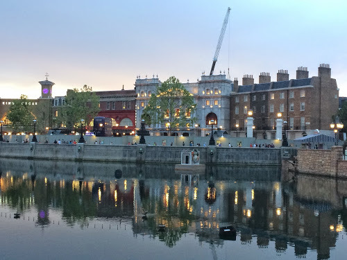 I took a stroll along the London Waterfront outside Diagon Alley at “magic hour” to capture some of the lighting features throughout the area. Let’s start with a panoramic overview of the construction area: