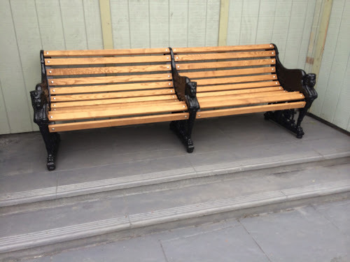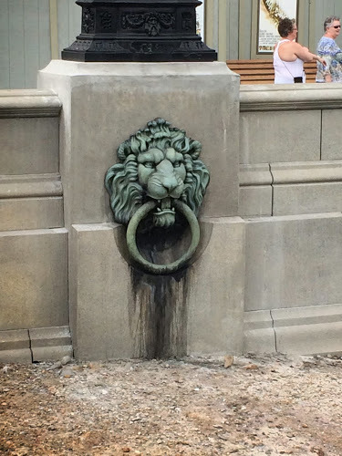 The stone lions beneath the lamp posts along the embankment have been aged, and staining has been applied to approximately half of the waterfront wall.