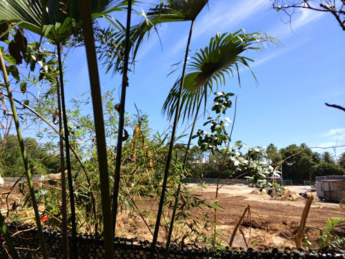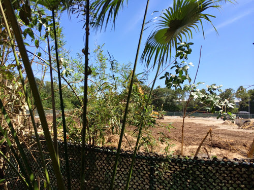 Entire area behind the T-Rex photo op has been defoliated, with a new green construction fence added where thick bamboo once stood.