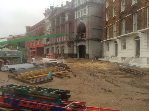 Construction continues on the Hogwarts Express Hogsmeade Station, and the structure that stands at the head of the path that will lead towards it.