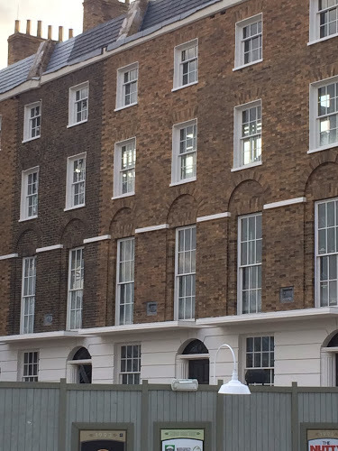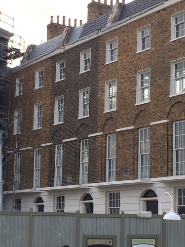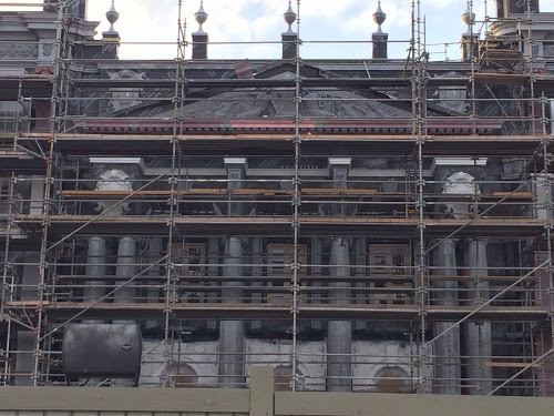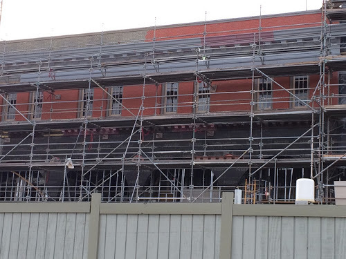A coat of reddish paint is being applied to the building between Wyndham and Kings Cross: