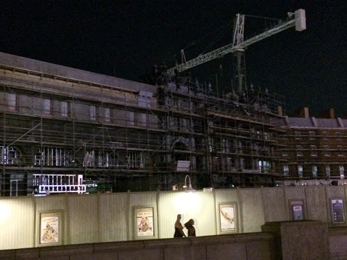 There’s been no noticeable progress on the Hogwarts Express since it completed its first test run, as reported in our last installment. Instead, let’s take a nighttime look at the London Waterfront, the facade that conceals Diagon Alley.
