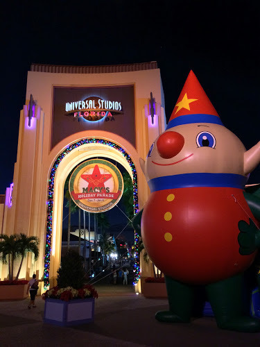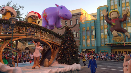 The Macy’s Holiday Parade proper steps off each evening at 5 p.m. (subject to change, check the show schedule in your park map) near the Horror Makeup Show; continues down Hollywood Boulevard towards the park entrance; travels past Despicable Me and Shrek towards New York; and then turns near the Revenge of the Mummy and again past Transformers, exiting through the gate it originally entered.