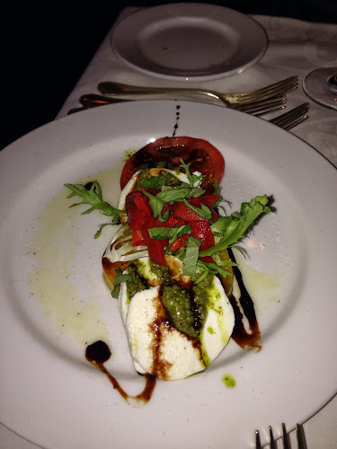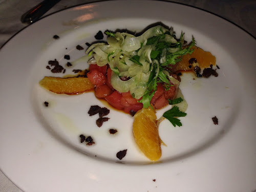 Following the fabulous bread service (don’t miss the rosemary bread with roasted garlic) we began with tuna tartare with fennel and orange, a delicious combination that was a refreshing change from the sushi-style tuna seasoning I’m used to; and a caprese red and yellow tomatoes, roasted peppers, soft-textured fresh mozzarella.