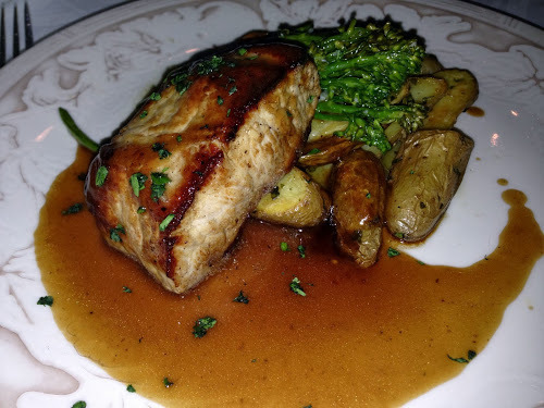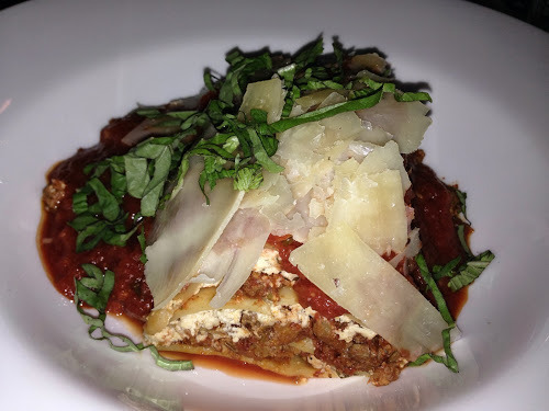 Main courses included Veal Marsala, which was not a flat pounded cutlet but a thick, juicy strip akin to pork belly, dressed with a rich wine sauce, roasted potatoes, and garlic sautéed broccoli rabe; and a hearty layered lasagna stuffed with large chunks of ground beef and pork, imaginatively enhanced with flavors of fennel and anise.