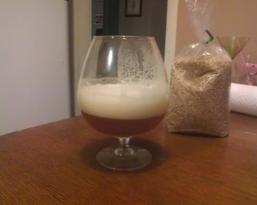 Belgian Trappist ale: Chimay ‘Cinq Cents’, posed with, apparently, bag of steel cut oats and mostly used-up paper towel roll.