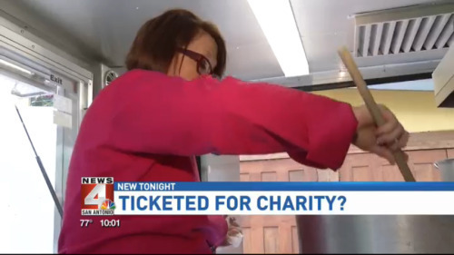 Joan is a trained chef who, for the last decade, has used her food truck to feed homeless people 3-course meals. On Tuesday, April 14th, Joan was ticketed by San Antonio police. She has a food permit for her mobile truck, but she was cited for transporting and serving some food from a vehicle other than that truck. There are good reasons for having food permit laws for mobile vehicles (sanitary considerations and public health), but those laws are usually reserved for people trying to sell food, not provide alms to the poor.