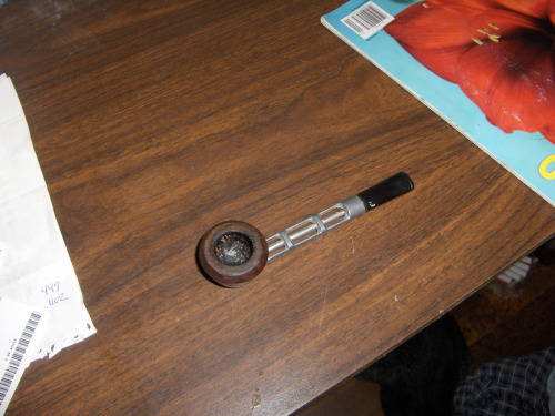 It stunk from age and his preferred weeds, which weren’t mine. I soaked the metal in Everclear, reamed the bowl. It’s a brand new pipe now. On the outside of the bit, you can see a little white paint, which I left in honor. The old man explains it as “I think I was smokin’ it when I painted something.”