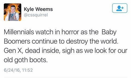 Gen Xers look on in amusement as Millennials are exactly like the Baby Boomers were when they were in their 20s, except they all have their heads down looking at their phones.