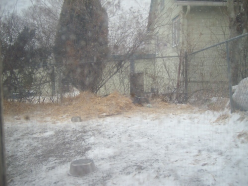 So here's a picture of the dogs, taken a few minutes ago from my window. It's 25 degrees and snowing pretty hard. The dog you can see is Oliver, the older one. He favors that one. Roscoe is younger and more rambunctious, thus, to Nick, more annoying. Roscoe is burrowed into that pile of hay next to Oliver. You can see a tiny piece of his back sticking out. When it's cold like this, their water, when they have it, is usually frozen. And animal control won't do anything. Oh, goody.