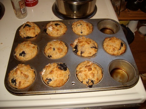Mix the dry stuff together and make a well in the center. Pour the (mixed) wet stuff in it and add about a half a cup blueberries. Mix together just until the dry stuff is pretty much moist. Don't mix too much. To make this vegan, skip the egg and use rice milk in place of skim. I guess you could use soy milk, but I think that stuff is raunchy.