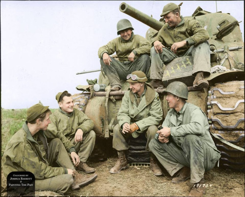 American journalist and war correspondent, Ernie Pyle (center), talks with the crew of a Sherman tank belonging to the 191st Tank Battalion at the Anzio Beachhead in 1944.