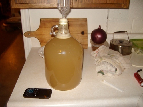 Ok, here it is all squared away. I will tuck it away in a quiet, dark place. That thing on top is a fermentation lock. It has 100-proof cheap-ass vodka in it to keep out the germs. The starting gravity is 1.083 (water is 1.000). In 3 days I will measure it again and it will have decreased. The difference will give me the alcohol content (using a formula). I'm shooting for about 6% alcohol, at which point I will refrigerate, stopping fermentation. It will be yummy at that point. Should take anywhere from 3 to 10 days…..