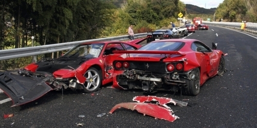 An outing of luxury sports car enthusiasts ended in an expensive freeway pileup Monday morning, smashing eight Ferraris, a Lamborghini, two Mercedes, and three other yet to be identified sports cars. More than 1 million dollars in vehicular awesomeness was lost in the gruesome carnage.