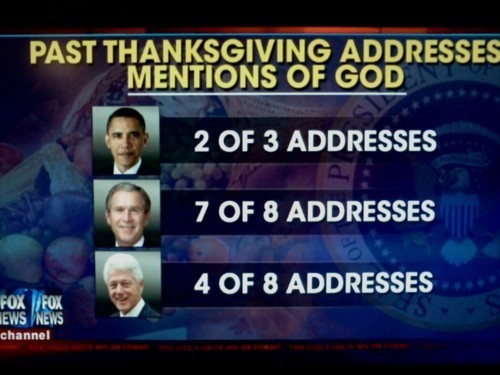 Obama, the most recent president, has had only three Thanksgivings so far in which to mention God, and he totally dropped the ball on it, too, mentioning God only twice. That's a God-mentioning rate of just 66%.
