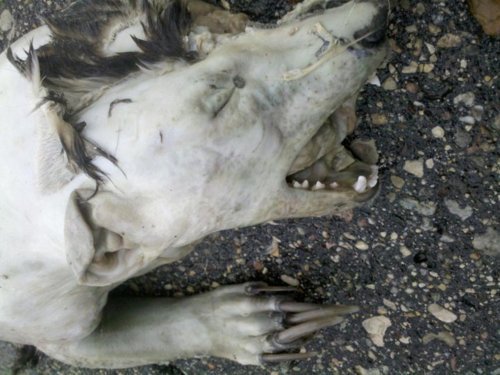 Jason Abraham, with the Department of Natural Resources, said he thinks it may be a domestic dog, but still has questions. "The head suggests a canine, very likely a domestic dog. However, the right front foot appears to have five toes, which is not typical for canines. Also, the extremely long toenails are not typical for a canine either. I'm baffled, a bit scared, and will certainly start going to church on Sundays like my wife has been bitching at me to do."
