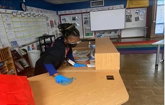Kimberly took on the role of custodian and began to physically clean the school herself. She put on rubber gloves, grabbed a custodian cart, and got to work wiping down desks, cleaning bathrooms, and mopping floors—anything she could do to keep the school clean and healthy for the students that day.