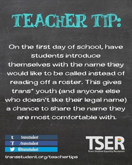 On the first day of school, have students introduce themselves with the name they would like to be called instead of reading off a roster. This gives trans* youth (and anyone else who doesn’t like their legal name) a chance to share the name they are most comfortable with.