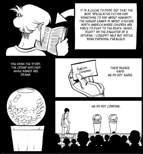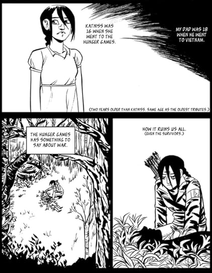 This is a short comic I did for Tor.com a few years ago, about The Hunger Games. I’m the daughter of a veteran; my father was sent to Vietnam when he was 18 years old. He suffers from depression and PTSD as a result, much like Katniss. I wasn’t born until the Vietnam War was years over with, but it still affected me in many ways.