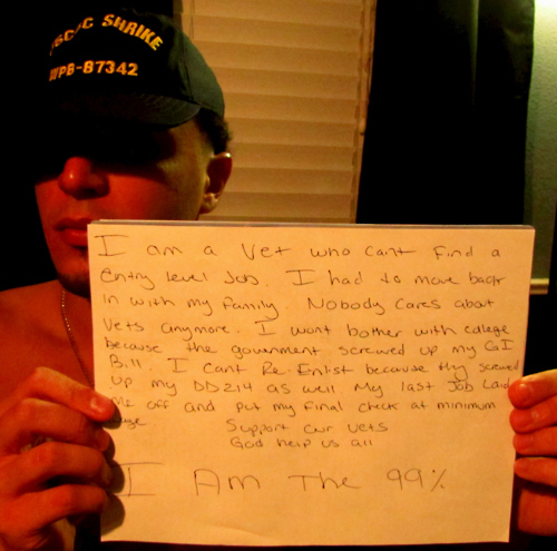 I am a vet who cant find a entry level job. I had to move back in with my family. Nobody cares about vets anymore. I wont bother with college because the government screwed up my GI BILL. I cant re-enlist because they screwed up my DD-214 as well. My last job laid me off and put my final check at minimum wage.