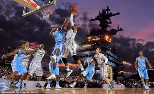 AP photographer Mark Terrill made of one the most visually stunning basketball pictures I've seen in quite awhile. He shot this during the Carrier Classic NCAA college basketball game aboard USS Carl Vinson.