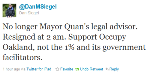This is a big deal. Dan Siegel, legal adviser to Oakland, Calif. Mayor Jean Quan, resigned over the brutalization of Occupy Oakland protesters and says he now supports the Occupy Wall Street movement. Approximately an hour ago, he wrote on Twitter, "No longer Mayor Quan's legal advisor. Resigned at 2 am. Support Occupy Oakland, not the 1% and its government facilitators."