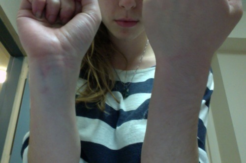 I don't know if you guys can see that well but those are the red marks on my wrists for being handcuffed for three straight hours today, with my hands twisted unnaturally behind my back.