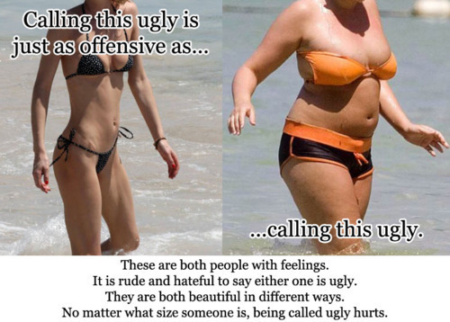 I cannot reblog this hard enough. I understand that because of our media and culture the person on the right probably gets a lot more insults than the person on the left, but that doesn't make it okay to hurl more insults: putting down someone else has never built anyone up.