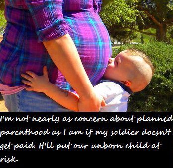 And, um, here's the kind of hilarious thing. (In a lolsob kind of way). If her soldier doesn't get paid, and she needs pre- or post-natal treatment, Planned Parenthood could help her out, as long as it gets the funding it needs. That is what the funding is for, y'know, the stuff they're trying to cut right now. I have a wonderful friend who credits PP and WIC for absolutely saving the life of her daughter (and likely her own life as well) by providing preventative care, vitamins, healthy food and psychological/mental health support at next to no cost while she was unable to work.