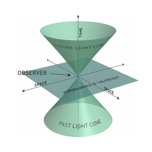 The implications of light cones are incredible. At each moment your body is being influenced by the volume of the entire universe, in a gradient from moments ago to the big bang. The size of the effect is mediated by the inverse square law, so the closest things effect you the most. However if one star in the andromeda galaxy, 2 million years ago, disappeared, there would be a minute change in the gravitational pull on the atoms of your body. Perhaps a salt ion in one of your neurons wouldn’t exit an ion channel, and your thoughts and life would be different. This effect goes forward into time as well, every action we take effects everything in out future light cone. As beings, we are completely integrated into the Universe, composed and created by every event in our past light cone, and manifesting everything in our future light cone.