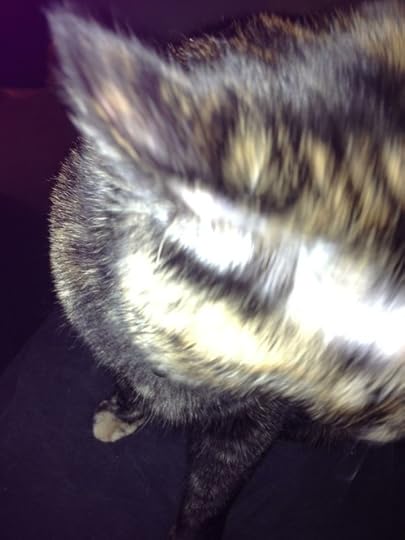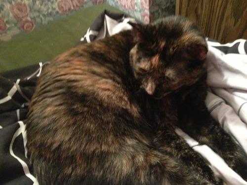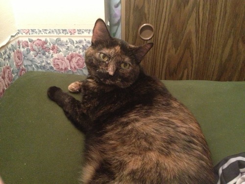 This is Yume. She’s a 4.5 year old female tortoiseshell. She’s chubby and a sweetheart and loves her tummy rubbed. She’s terrified of outside and loves her fishing pole. Along with Yume, she responds to Bub, Bubba, and Bubby. When she’s happy, she likes to knead boobs and tummies and purr ferociously while doing so. She’s very potty trained and will go in it even if it’s dirty. She’s a good girl. Her favourite toys are the fishing pole, alone or with a tinsel attachment, giant colourful mice, and sometimes she likes shaky mice. She loves catnip too. She does not like her tail pulled (but what cat does?), she hates when someone blows on her, and she’s terrified of small children.