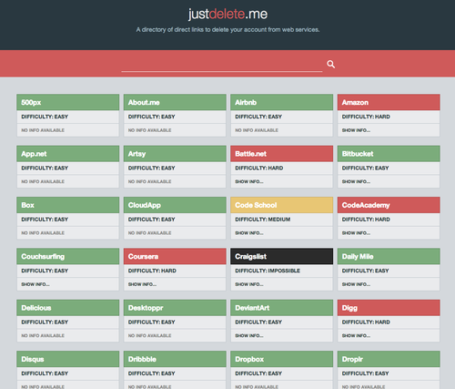 JustDelete.me even color codes web services by how difficult it is to delete yourself from each site, with green being the easiest, and black being impossible. (Good luck deleting yourself from Craigslist.)