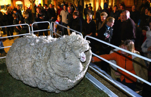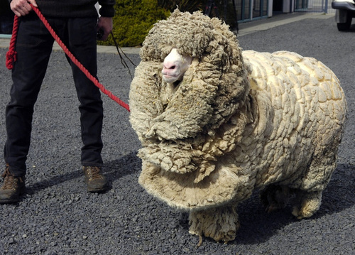 Meet Shrek, a wily Merino sheep in New Zealand who managed to avoid being shorn for 6 years in a row by hiding in a cave each time shearing season arrived. The two photos at the top of this post show you what Shrek looked like when he was finally caught back in 2004. Farmers weren’t even sure he was a sheep when they found him. Shrek was covered in an awesome, if a bit dirty, layer of fleece that weighed a whopping 60 pounds. That’s enough wool to produce 20 men’s suits.