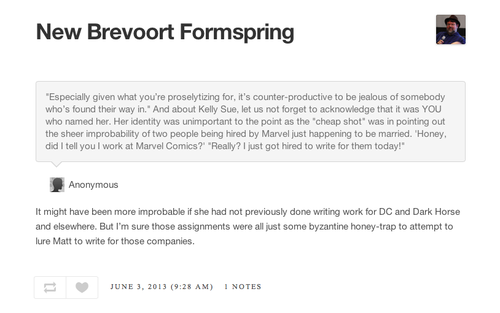 I was recently directed to a post on a snake pit of a message board (what was I thinking, even going to look?) by a man I’d known as long as I’d known my husband, a man I’d met at the same time—a man who had felt free to ask professional favors of me on multiple occasions—who was lamenting how “easily” I’d gotten to where I was because of Fraction. When friends of mine pointed him to my CV, he half-apologized because he had no idea. Apparently he thought Marvel—a publicly-owned company—was in the habit of handing out gigs to freelancer’s wives just for kicks. Then he threw up the bit about it being a natural assumption.