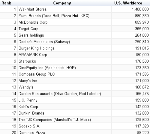 With this as the backdrop, the National Employment Law Center (NELP) has published a list of the 50 U.S. companies who have the most low wage workers. While not all of these companies pay the exact minimum wage they all pay very close to the wage floor. As you can see by the list, the companies listed also share a common trait of being massive, successful companies making major profits. Perhaps their universally low labor costs have something to do with that trend?