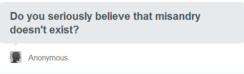 Misandry was a dead word until recently. A group of men who feared the progress of feminism revived the word and used it to undercut the movement. They like having the power being a man provides and they don’t want to lose that. So they created a movement, found a bunch of legitimate issues that affect men, and tried to blame women for those issues. They called this misandry. It’s like conservatives using buzzwords like “death panels” to make people fear health care. They let people assume it meant Obama wanted to kill your grandma. They let their cute little phrase infect the minds of good people and convince them of falsehoods.