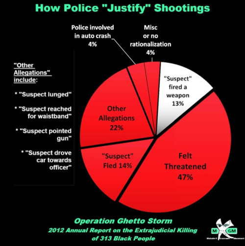 Following the murder of Trayvon Martin, the MXGM embarked on a year-long study to determine the prevalence of extrajudicial killings of black Americans. The organization initially recorded around 120 killings in the first half of 2012, which came out to one black person murdered every 36 hours. That number climbed to 313 by the end of last year, forcing the MXGM to update its findings to every 28 hours in their latest report, titled “Operation Ghetto Storm“. That’s almost one black American killed every day by law enforcement, security guards and/or vigilantes, which the MXGM believes is more accurate since their numbers reflect only those killings that are reported by police departments and the news media. As the organization points out in the report, there exists no national tracking of police-involved shootings, so it’s impossible to know the full extent of the crisis.