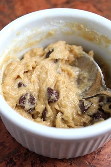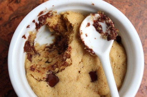 In a small ramekin or microwavable cup, combine softened butter and both sugars; stir well with a spoon. Stir in beaten egg and vanilla extract. Stir in flour, baking soda, and salt just until combined. Stir in chocolate chips.
