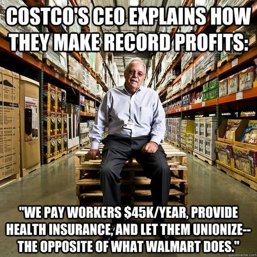 Costco announced record profits today, averaging $10,000 in profit per employee compared to $7,400 at Walmart.