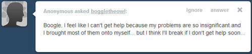 The thing is, so many depressed people secretly think this way. It’s a depression mind trick that keeps so many people who need help from seeking it out. I just hope drawing attention to it here, where it’s so clearly stated, might help a few people spot the contradiction in their own minds. Anon, please go get help. Your problems are obviously not insignificant.