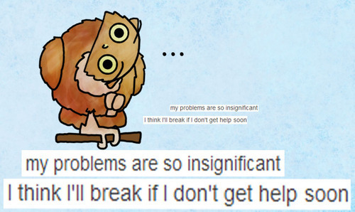 “What makes you so special? There are people out there suffering way more than you, way worse off than you. They deserve help more than you. In fact, since you are a screwup, you probably deserve to suffer. This painful and shitty life is your punishment for being useless. You can’t handle the slightest adversity without folding like a wet noodle. Look at you! Your problems are tiny and you are still pissing and moaning and unable to deal with them. You are a disappointment to the very oxygen you breathe. You are a worthless lump who should never have been brought into this world, and you should immediately apologize to your mother’s vagina and throw yourself into a bear pit.” (I am sorry I even had to type that out. THOSE THINGS ARE NOT TRUE, OP.)