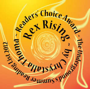 Rex Rising has won third place in the Underground Book Reviews Summer Reading List contest (The Readers’ Choice winners). I’m happy, of course, and here is the lovely badge sent to me to display proudly: